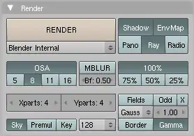 Now, let's move on to the render tab! The first thing you should notice is the VERY BIG button that says 'Render' on it. This button performs the same action as the F12 button. Below this is a drop-down box, allowing you to change between the Blender Internal Render engine and YAFRAY. (For more on YAFRAY, see YAFRAY Render Options). Next to the 'Render' button are 5 buttons: Shadow, Env Map, Pano, Ray, Radio. These are explained in detail below: