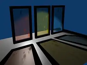 Totally clear glass does not show where the lightrays travel through it. But if the glass is dirty or uneven you will see the path of the light. In the first example (Translucency 1) the glass material has a transparency of about 0.5 and a translucency of 0.78. So the glass is brighter where the lightrays hit the surface from behind. Additionally a Transparencymap - which sets Alpha to 1 - lets the surface appear to be stained. If we use the same map also as a Translucencymap (Translucency 2), the stain appears to be lit - which it would be of course also in reality.