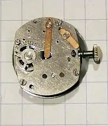 Base movement Model 24 has an oval-rectangular dial plate, and a mostly circular back plate, with a flat at 2:00. Balance is at 5:00. First used in 1963, continued with minor modifications until mechanical production ended.