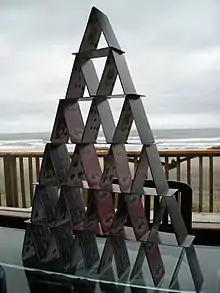One of the most familiar form of a house of cards involves the creation of a triangular pyramid-style structure formed from a series of identical smaller structures that each emulate an inverted letter V.