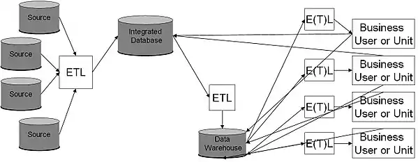 Finally, there is the case where an integrated Database feeds a Data Warehouse. In this case the business user or business unit both extracts the data for reporting purposes and also updates the data. Regardless of the type of source it is important to obtain the enterprise data warehouse architecture, especially the metadata on each data source.