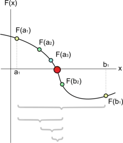 Suppose we want to solve the equation . Given two points and such that and have opposite signs, the intermediate value theorem tells us that must have at least one root between and as long as is continuous on the interval . If we know is continuous in general (say, because it's made out of rational, trigonometric, exponential and logarithmic functions), then this will work so long as is defined at all points between and . So, let's divide the interval in two by computing . There are now three possibilities: