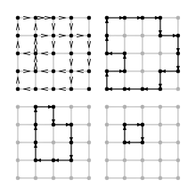 In the image to the right, a divergence free vector field that denotes flow density is decomposed into the superposition of multiple simple loops. 2 dimensional space is depicted as a lattice of infinitely small squares. The vector field is the top-left section. The flow along each horizontal edge, denoted by the direction and number of arrows, is the horizontal component of the vector field at the current edge (or neighboring vertex). The flow along each vertical edge, denoted by the direction and number of arrows, is the vertical component of the vector field at the current edge (or neighboring vertex). The remaining 3 sections show 3 simple loops whose superposition forms the vector field.