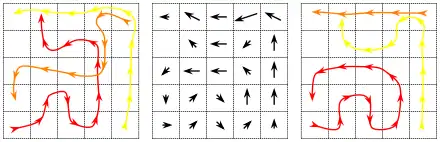 In the image below, the multi-path in the left panel is converted to the vector field in the center panel by computing the total displacement in each cell and averaging over the volume. The volume of each cell should be infinitesimal. The multi-path in the right panel corresponds to the same vector field, and is in a more canonical form where the individual paths do not cross each other.