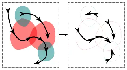 ![]() A 2D image showing the intersection of a multi-path (dark blue dashed curves) with a multi-surface (dark red solid curves). Positive intersection points (red circles) occur when a path intersects a surface in the preferred direction. Negative intersection points (teal circles) occur when a path intersects a surface in the opposite direction. The intersection is effectively a multi-point. |
