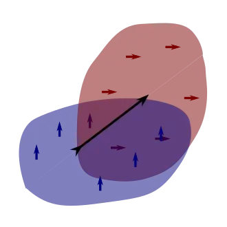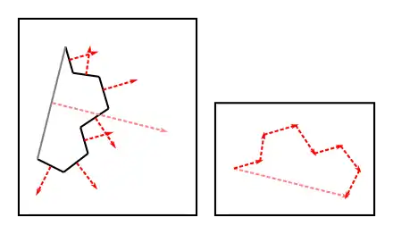 ![]() This image depicts how in 2 dimensions, the total surface vector of a 1D surface is a 90 degree rotation of the displacement between the two endpoints (the boundary of a 1D surface), and is therefore purely a function of the endpoints. In the left panel, a 1D surface is a sequence of black line segments, and the surface vectors of each segment are denoted by the dashed red arrows. Each surface vector is a 90 degree rotation of the displacement along the surface. The long grey line is the net displacement between the endpoints of the surface, and the dashed pink arrow is a 90 degree rotation of this net displacement. In the right panel, the pink arrow is shown as the sum of the dashed red arrow vectors, hence the "total surface" is purely a function of the 1D surface's endpoints. |