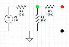 The original voltage between green and black is going to be the same voltage between red and black. The total Resistance will be r1+r2.