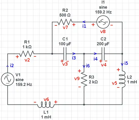 Complex 3R, 2L, 2C, voltage and current source circuit