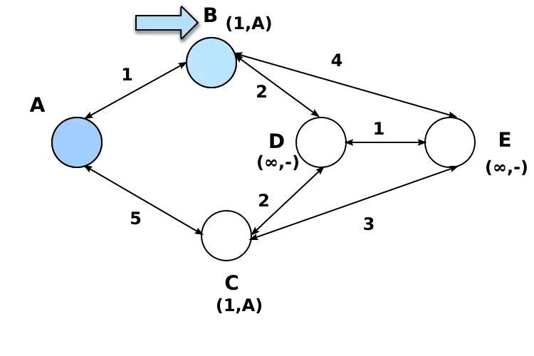 Initially, each node sets a cost of 1 to its directly connected neighbors and infinity to all the other nodes. Below is shown the initial routing table at node A: