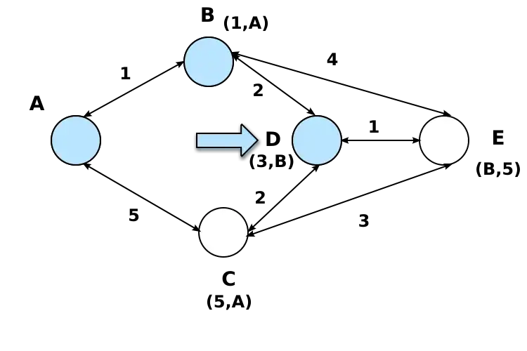 2. For the network in exercise 1, show how the link-state algorithm builds the routing vector table for node D.