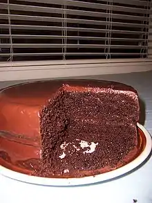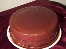 5. Immediately 'frost' the cake with this, and make sure that there is quite a bit between the two layers of cake. The cake will need to be refrigerated to harden the fudge, so don't worry about its relatively liquid nature.