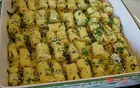 Khandvi (in Gujarati) or Surali Chya Vadya (in Marathi) is a famous Western Indian dish. It is similar to rolled pasta made from chickpea flour. It is savoured as a snack or as a starter and is extremely popular in Gujarat and Northwestern Maharashtra.