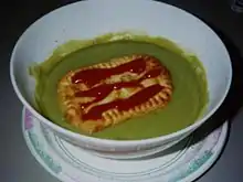 - Place the pie upside down in the dish, and pour the pea soup around it until the dish is full.