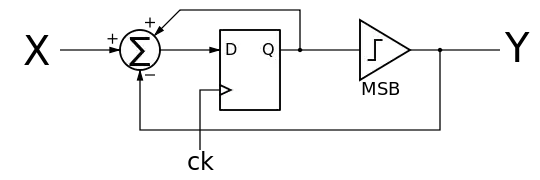 The first order ΣΔ modulator consists out of an accumulator and a comparator.