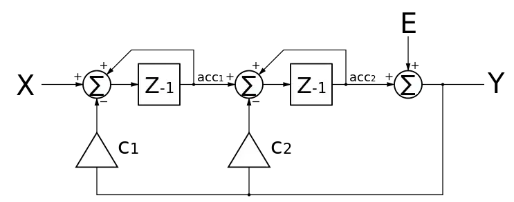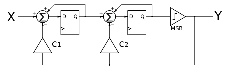 A second order ΣΔ modulator will require 2 accumulators. Different topologies are possible. The following circuit shows a typical second order circuit.