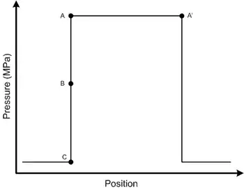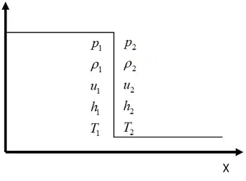 A propagating disturbance of this type, which generates a discontinuous change in pressure, temperature, enthalpy, internal energy, density and particle velocity is referred to as a shock wave. A shock-wave is depicted schematically in the following figure: