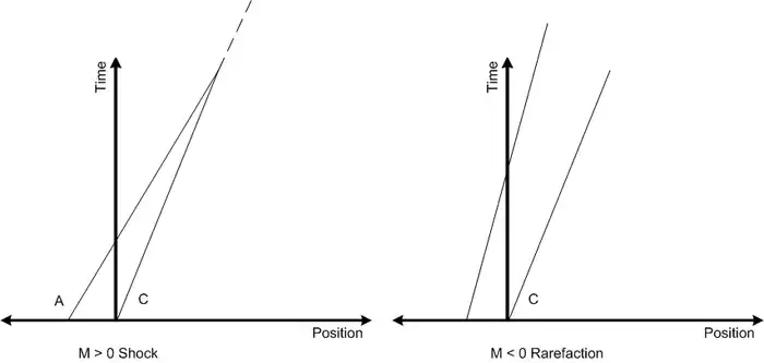 It is important to note that our mathematical and conceptual discussions have ultimately yielded analogous descriptions of shock-wave formation and behaviour. In the mathematical discussion we can see that each characteristic corresponds to trajectory of a specific point on the waveform depicted in either or space. The history of these characteristics tracks how specific portions of the waveform overtake or lag behind the others. In the case of a set of converging characteristics the point of intersection corresponds to a mathematical singularity and the formation of a shockwave. In the case of diverging characteristics we can see that the waveform points begin smearing out in space - this is clearly analogous to the description of rarefaction waves.