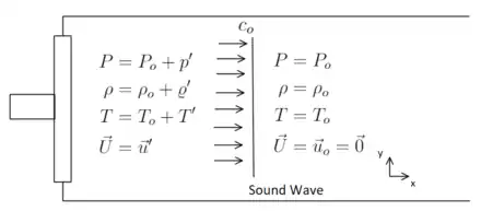 where is the ambient density; , the density fluctuation; , the ambient temperature; , the temperature fluctuation; , the mean velocity; and , the particle velocity. Notice that pressure, density, and temperature are scalar quantities and the particle velocity is a vectorial quantity.