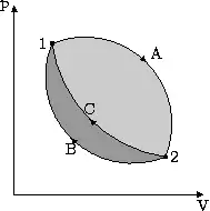 A consequence of the above statement is that work done is not a state function, since it depends on the path (which curve you consider for integration from state 1 to 2). For a system in a cycle which has states 1 and 2, the work done depends on the path taken during the cycle. If, in the cycle, the movement from 1 to 2 is along A and the return is along C, then the work done is the lightly shaded area. However, if the system returns to 1 via the path B, then the work done is larger, and is equal to the sum of the two areas.