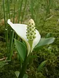 | The plants of the Araceae (arum family) have numerous small flowers that are part of a spadix, a spike inflorescence on which the flowers are borne on a fleshy stem. The spadix is usually surrounded by a bract called a spathe.