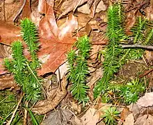| The Huperzioideae, known as firmosses, have also been treated as a separate family Huperziaceae. Firmosses differ from other Lycopodiaceae in that they grow in clumps, instead of producing creeping, horizontal stems like other family members.[1] Of the three genera in this group, Huperzia is a temperate and arctic genus and is the only one found naturally in New York. Of the other two genera, Phlegmariurus is native to tropical and subtropical regions, and Phylloglossum is native to Australia and New Zealand.