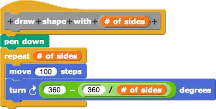 With the number of sides we can determines the internal angle of the shape, which is all we need to draw the shape. Please checkout this resource if you are not sure how to calculate the internal angle using the number of sides. This block can serve as an abstraction of the tasks of drawing equal-lateral shapes (polygons). You may have noticed the length of the sides is hard-coded (typed in as a constant not a parameter). What if we want to draw shapes of different size? We can further generalize the function of the block by adding anther parameter and use it to control the side length.