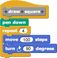 Lets look at a concrete example. In order to make a sprite to draw different equal-lateral shapes we can create a block for drawing each type of shapes such as triangles, squares, pentagons, and etc. A block in Snap! is an abstraction that hides details and represents a certain behavior/intention. The following block draws a square with a specific size.