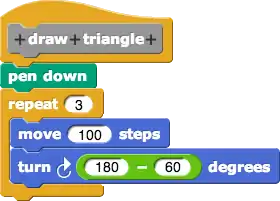 The draw triangle block repeat three times to draw each side with a turn of 120 degrees. Do you know why the sprite has to turn 120 degrees to form a 60 angel between the two sides? I hope you have noticed that the same logic structure can be used to create blocks for drawing any equal-lateral shapes. Instead of creating a block for each shape we can generalize the task into one block that can draw any shapes. This block needs an additional piece of information - the number of sides.
