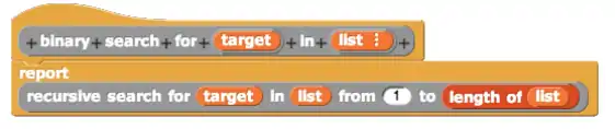 Another way to simplify the binary search solution is adding another level of abstraction. The helper block below shows the target and list being passed in as input into the "binary search for" block (see below). The actual recursive solution is implemented when the recursive search block detects the first and last index of a sorted list. The "binary search for" block allows users to call the recursive search without the user being required to provide the first and last indices. The user will only see the information and/or blocks necessary to start the binary search. The user will not see the recursive search or behind the scenes of the solution).