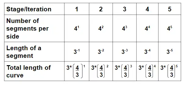 Examining each stage of the Koch Snowflake a pattern is created for the number of segments per side, the length, and the total length of the curve as seen below. The number of segments per sides is increased four times the previous stage. The length of the segment is divided into equal thirds each time giving us the length of each segment. The original stage, an equilateral triangle, is why we take three times the number of segments per side divided by the length of a segment raised to the number of the stage currently being implemented.