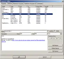 This tab shows a list of all features of the sequence. Features can be added, edited, and deleted. Most of the settings should be self-explanatory.