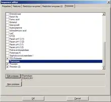 This tab holds a list of available proteases. Potential cleavage sites for selected (checked) proteases are shown in the sequence (not in the DNA map).