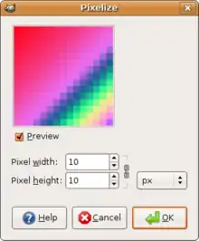An example of the dialogue window of the Pixelize filter. It contains a preview of an image with the pixel size set to 10x10