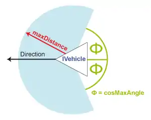 These 3 functions get 3 equal parameters: The float value maxDistance defines the proximity area in which other vehicles affect this vehicle. The float value cosMaxangle defines angular borders in which other vehicles do not affect this vehicle. Obviously the list of IVehicle contains all the vehicles that may have the ability to influence this vehicle. But that is not the end of the story. There are also: