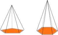 When cutting a pyramid or cone, cutting horizontally will result in shapes that are similar to the base. (When shapes are similar, it means that they have the same shape but different size. See the chapter on similarity for details.) When cutting a pyramid vertically, a triangle or a parallelogram can be formed depending on the situation. If you cut a corner or cut right across the middle (i.e. three surfaces are involved), then a triangle will be formed. Otherwise, a parallelogram will be formed. On cones, cutting vertically will result in a triangle in the same situation, but otherwise, will result in what looks like an arch. When you cut a pyramid obliquely, the shapes formed can vary a lot!