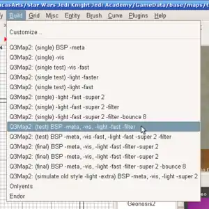 After all three have closed, check the folder where you saved the .map file, there should now be a .bsp file in the same folder with the same name as the map. If this is the case, start up the game you are mapping for, in this case Star Wars Jedi Knight: Jedi Academy and get into the ingame console (SHIFT+KEY BELOW ESC). Here, type /devmap mapname where you replace mapname with the name of your map file without the extension. So if your compiled map file would be called firstroom.bsp you would type /devmap firstroom and hit enter.