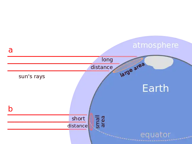 As one can see from the diagram below, if the sun strikes the ground at a small angle, the solar radiation will be spread across a large area. If the sun strikes the ground at a right angle, the solar radiation will be most intense (this is known as overhead sun):