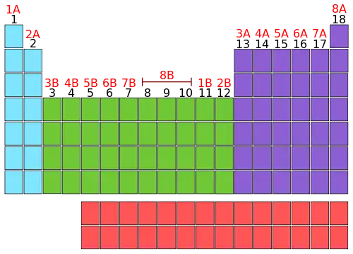In older periodic tables, the groups were numbered using an A and B group numbering system. The representative groups (s and p blocks) were numbered with A and the transition elements were numbered with B. The table below has both numbering systems. The A numbering is shown for you in the diagram in red; this is all we will be concerned with for this lesson. The number of valence electrons in the A groups increases as the group number increases. In fact, the number of the A groups is the number of valence electrons. Therefore, if an element is in group 3A, it has 3 valence electrons, if it is in group 5A, it has 5 valence electrons.