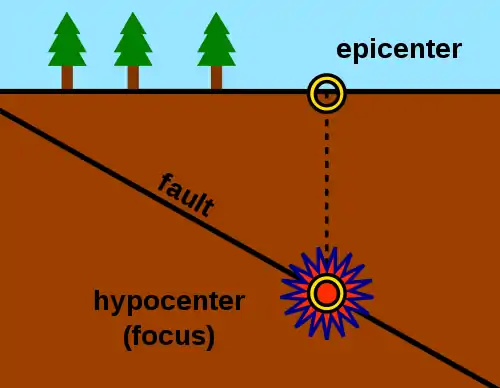 Just above the focus on the land surface is the earthquake's epicenter (Figure 7.26). It is the epicenter of an earthquake that is reported by scientists and the media. The epicenter of the 1906 San Francisco earthquake, for example, was offshore, 1.5-3 kilometers (1-2 miles) west of Golden Gate Park.