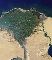 | Figure 13.8: (Left) This estuary at Damas Island, Costa Rica, shows how water, plants, and land all come together in an estuary. (Right) This is a satellite image of the Nile Delta, showing the unique ecosystem around the estuary, and its shape (the name delta comes from the Greek letter Δ). | |