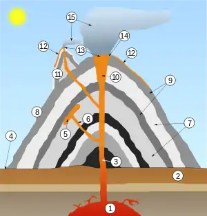 As you can see in Figure 8.2, magma begins in the lava chamber and comes to the surface through the throat of the volcano. The volcano is constructed layer by layer, as ash and lava solidify, one upon the other. However, other types of volcanoes exist, and will be discussed later in this chapter.