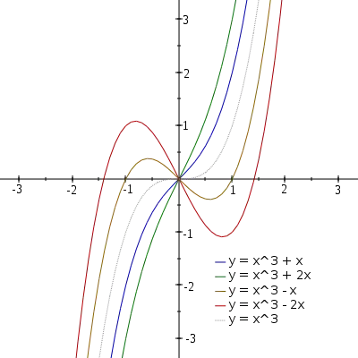 - Use a graphing calculator to graph the functions y = x3 + x, y = x3 + 2x, y = x3 − x, and y = x3 − 2x. What is the effect of changing the coefficient on the second term?
