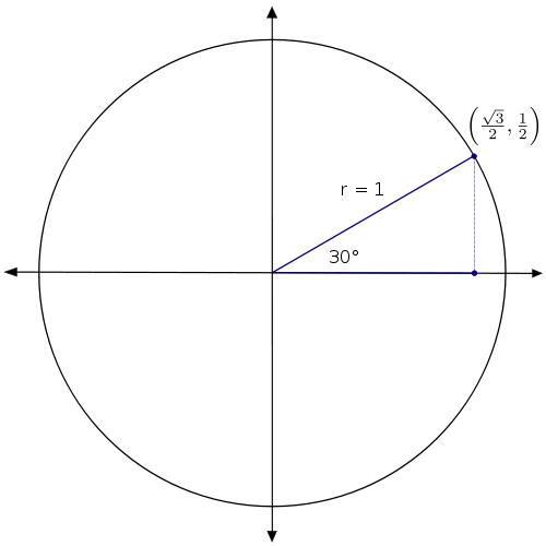 The terminal side of the angle intersects the unit circle at the point . (You will prove this in one of the review exercises.). Therefore we can find the values of any of the trig functions of 30°. For example, the cosine value is the x-coordinate, so cos (30°) = . Because the coordinates are fractions, we have to do a bit more work in order to find the tangent value: