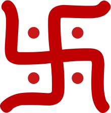 The swastika (from Sanskrit svástika) is an equilateral cross with its arms bent at right angles, in either right-facing form or its mirrored left-facing form. Archaeological evidence of swastika-shaped ornaments have been dated to the Neolithic period and was first found in the Indus Valley Civilization of the Indian Subcontinent. It occurs today mainly in the modern day culture of northern India, sometimes as a geometrical motif and sometimes as a religious symbol.