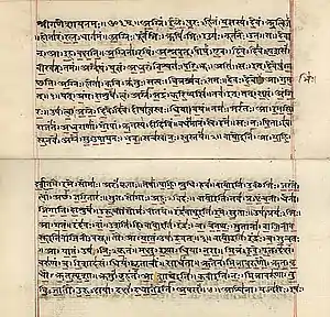 Ancient Indian culture ensured that these texts were transmitted from generation to generation with inordinate fidelity.[9] For example, memorization of the sacred Vedas included up to eleven patha (forms of recitation) of the same text. The texts were subsequently "proof-read" by comparing the different recited versions. Forms of recitation included the jaṭā-pāṭha (literally "mesh recitation") in which every two adjacent words in the text were first recited in their original order, then repeated in the reverse order, and finally repeated again in the original order.[10]