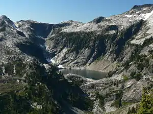 Besides the erosional and depositional features already mentioned, glaciers leave behind some highly distinctive landforms. Consider for example the photograph to the right. There is no longer a glacier present, and, indeed, a lake has formed at the former accumulation point. (Such a lake is known as a tarn.)