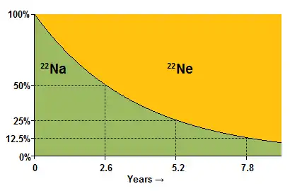 where N0 is the original quantity of 22Na, 2.6 is the half-life in years, t is the time elapsed as measured in years, and N(t) is the quantity of 22Na left in the sample at time t.