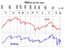 The Hallam and Vail curves are presented in the chart to the right. Note that these are "first order" curves which only show broad trends: they are not on a fine enough scale to show the fluctuations caused by recent advances and retreats of sheet glaciers.
