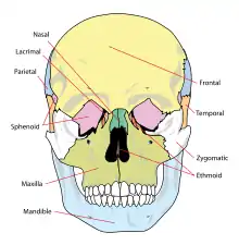 The human skull can be divided into two sections, the cranium and the face. In most people, the cranium is made up of 8 bones and the face is made up of 14. Often, the ossicles of the ear and the hyoid bone are counted as part of the skull, giving the normal human skull 29 bones (it should be noted that variations are not necessarily abnormal).