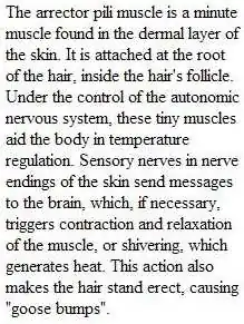 The dermis lies below the epidermis and contains a number of structures including blood vessels, nerves, hair follicles, smooth muscle, glands and lymphatic tissue. It consists of loose connective tissue otherwise called areolar connective tissue—collagen, elastin and reticular fibers are present. Erector muscles, attached between the hair papilla and epidermis, can contract, resulting in the hair fiber pulled upright and consequentially goose bumps. The main cell types are fibroblasts, adipocytes (fat storage) and macrophages. Sebaceous glands are exocrine glands which produce a mixture of lipids and waxy substances known as sebum. Sebum serves many functions, including lubrication, water-proofing, softening, and also provides antimicrobial properties. Sweat glands open up via a duct onto the skin by a pore.